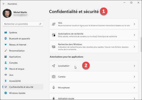 Pour définir si les applications peuvent utiliser votre emplacement pour proposer des services géolocalisés, cliquez sur Confidentialité et sécurité (1), puis sur Localisation (2) :