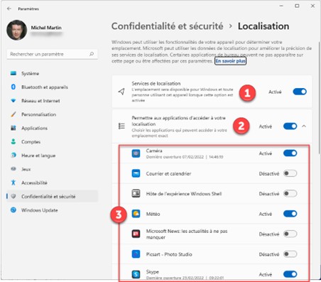 Placez l’interrupteur Services de localisation (2) en position Activé pour autoriser les applications à vous géolocaliser. Placez l’interrupteur Permettre aux applications d’accéder à votre localisation (2) en position Activé, et choisissez quelles applications peuvent utiliser la géolocalisation en mettant leur interrupteur sur Activé (3) :