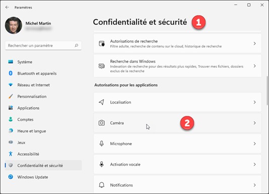 Pour choisir quelles applications peuvent utiliser votre Webcam, cliquez sur Confidentialité et sécurité (1), puis sur Caméra (2) :