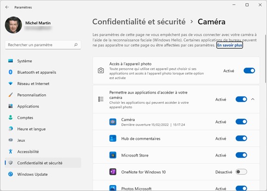 Placez les interrupteurs Accès à l’appareil photo et Permettre aux applications d’accéder à votre caméra en position Activé, puis autorisez ou interdisez l’accès à la webcam pour les applications concernées :