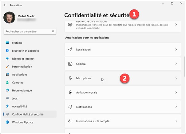 D’une façon similaire, cliquez sur Confidentialité et sécurité (1), puis sur Microphone (2) pour choisir quelles applications peuvent utiliser votre microphone :