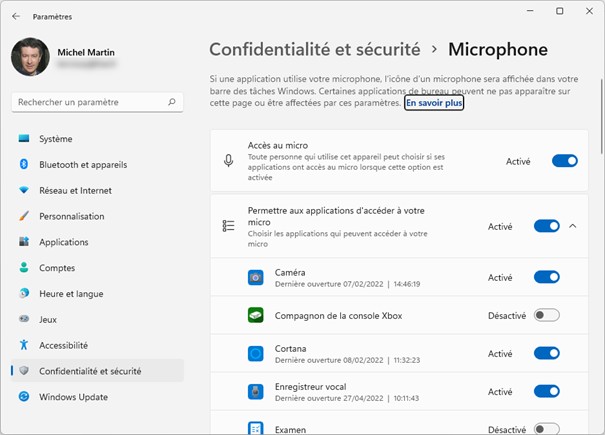 La fenêtre Confidentialité et sécurité/Microphone s’affiche. Placez les interrupteurs Accès au micro et Permettre aux applications d’accéder à votre micro en position Activé, puis autorisez ou interdisez l’accès au microphone pour les applications concernées :