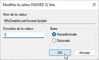 Pour modifier la valeur NtfsDisableLastAccessUpdate, double-cliquez dessus, entrez :