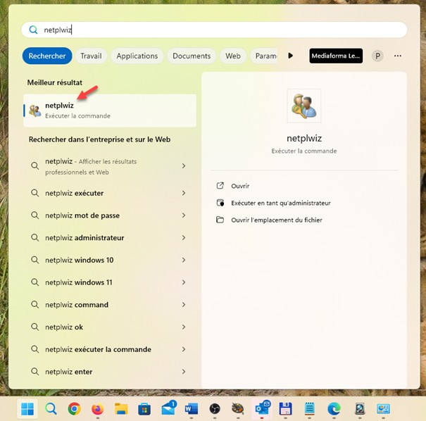 Cliquez sur Démarrer ou appuyez sur la touche Windows du clavier, tapez netplwiz, puis cliquez sur netplwiz dans la partie supérieure du menu Démarrer :