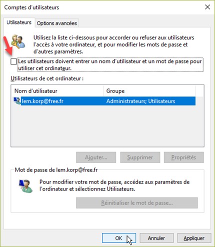 Cette action affiche la boîte de dialogue Comptes d’utilisateurs, onglet Utilisateurs sélectionné. L’utilisateur actuel est surligné. Décochez la case affichée dans la partie supérieure de la boîte de dialogue et cliquez sur Appliquer :