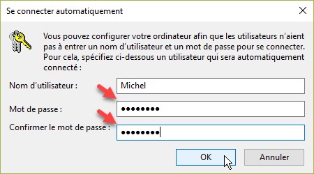 Une nouvelle boîte de dialogue intitulée Se connecter automatiquement est affichée. Entrez le mot de passe dans les deux zones de texte et validez en cliquant sur OK.