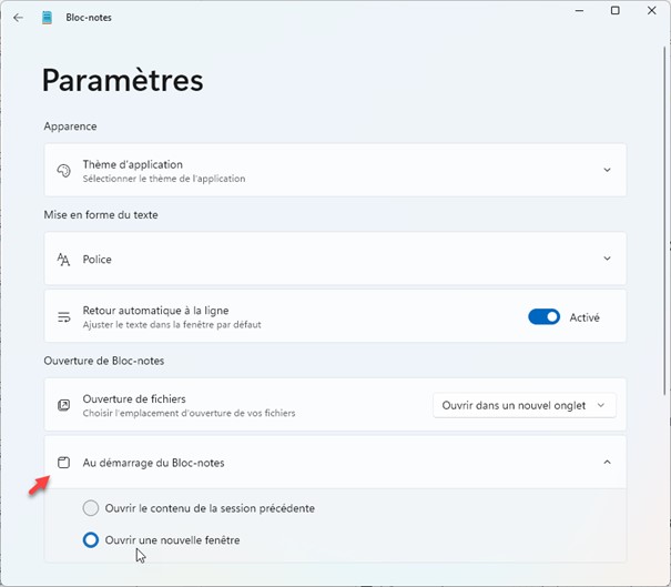 Développez le groupe d’options Au démarrage du Bloc-notes et choisissez l’option Ouvrir une nouvelle fenêtre :