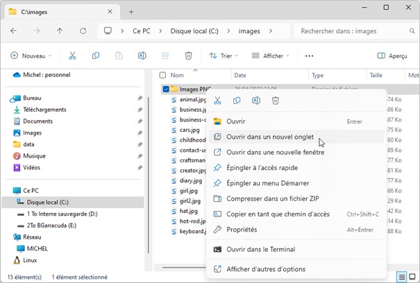 Pour ouvrir un dossier dans un nouvel onglet, cliquez avec le bouton droit de la souris sur ce dossier et choisissez la commande Ouvrir dans un nouvel onglet dans le menu contextuel :
