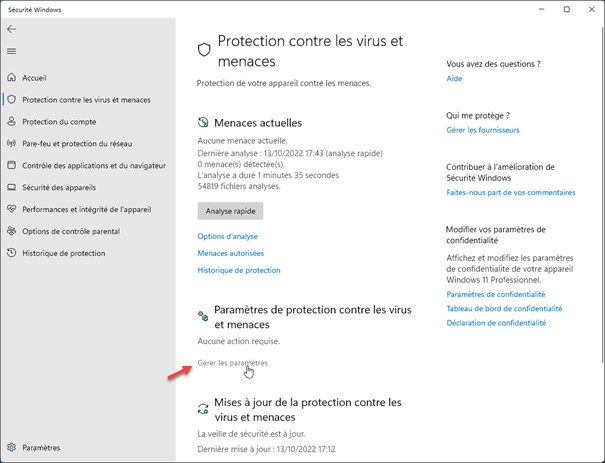 La fenêtre Sécurité Windows s’affiche. Cliquez sur Protection contre les virus et menaces dans le volet gauche. Sous Paramètres de protection contre les virus et menaces, cliquez sur Gérer les paramètres :