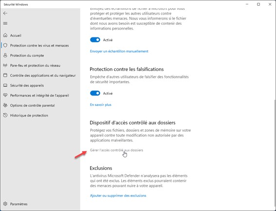 Déplacez la partie droite de la fenêtre pour atteindre la section Dispositif d’accès contrôlé aux dossiers et cliquez sur Gérer l’accès contrôlé aux dossiers.
