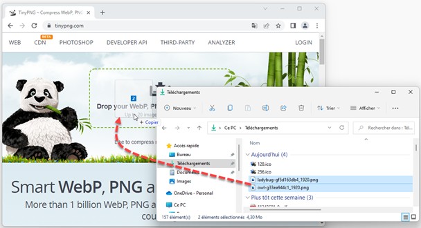 Ouvrez l’explorateur de fichiers. Déplacez-vous dans le dossier qui contient les images PNG dont vous voulez réduire le poids et sélectionnez-les en appuyant simultanément sur les touches Contrôle et A. Rendez-vous sur le site https://tinypng.com/ et faites glisser les images PNG dans la zone prévue à cet effet en maintenant le bouton gauche de la souris :
