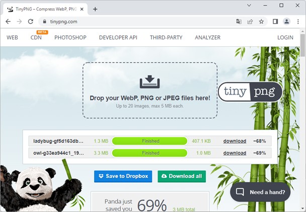 Au relâchement du bouton gauche de la souris, les images sont allégées. Quelques instants plus tard, vous pouvez les télécharger en cliquant sur les liens Download correspondants. Solon les images, vous obtiendrez un allègement de 40% à 80% :