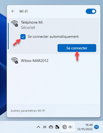 Cliquez sur la connexion à utiliser. Si vous souhaitez vous connecter automatiquement lorsque cette connexion sera disponible, cochez la case Se connecter automatiquement puis cliquez sur Se connecter.