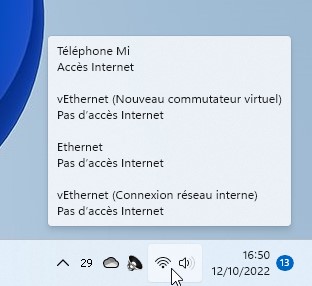 Cliquez dessus, puis cliquez sur la flèche, à droite de Disponible pour identifier la ou les connexions disponibles. Ici par exemple, deux connexions Wi-Fi sont disponibles :