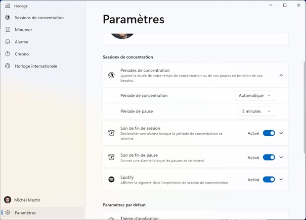 Il est possible de paramétrer les sessions de concentration. Cliquez sur l’icône Paramètres, dans l’angle inférieur gauche de la fenêtre Horloge. La fenêtre Paramètres s’affiche. Sous Sessions de concentration, vous pouvez :