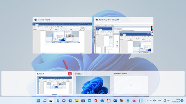 Pour supprimer un bureau virtuel, appuyez simultanément sur les touches Windows et Tabulation, puis cliquez sur la case de fermeture de la vignette qui représente le bureau virtuel à supprimer. Les applications qui se trouvaient sur ce bureau sont automatiquement transférées sur le bureau précédent :