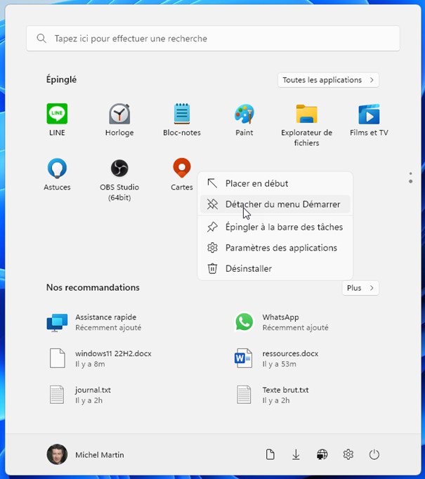 Pour supprimer un raccourci épinglé dans le menu Démarrer, appuyez puis relâchez la touche Windows, repérez le raccourci, cliquez dessus avec le bouton droit de la souris et sélectionnez Détacher du menu Démarrer dans le menu contextuel :