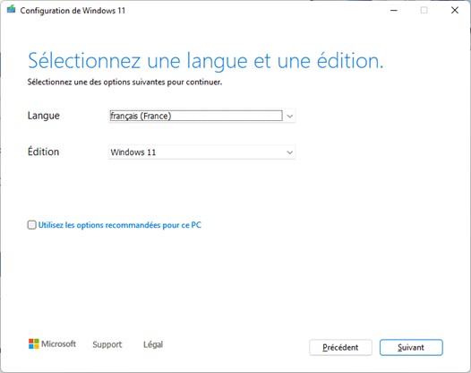 Cliquez sur Accepter. Une deuxième boîte de dialogue s’affiche. Choisissez une langue et une édition de Windows 11, puis cliquez sur Suivant :