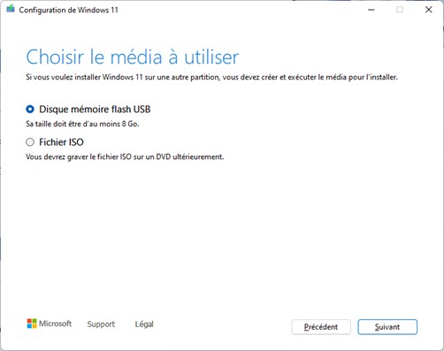 Une nouvelle boîte de dialogue s’affiche. Sélectionnez l’option Disque mémoire flash USB, puis cliquez sur Suivant :