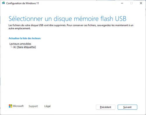 Désignez le lecteur USB à utiliser, puis cliquez sur Suivant :