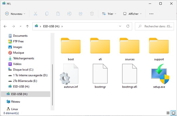 Lorsque le téléchargement est terminé, il est vérifié. Cette opération est assez rapide. Commence alors la création du média à proprement parler. Selon le type de clé et le type du port utilisés, vous devrez patienter entre quelques minutes et une bonne dizaine de minutes. Une fois l’opération terminée, il ne vous restera plus qu’à cliquer sur Terminer pour pouvoir utiliser votre clé. Voici les fichiers contenus dans la clé en fin de processus :