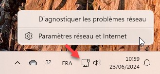 Cliquez avec le bouton droit de la souris sur l’icône Accès Internet dans la zone de notification, puis sur Paramètres réseau et Internet dans le menu contextuel :