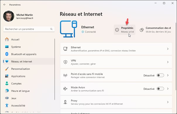 La fenêtre Réseau et Internet s’affiche. Cliquez sur l’icône Propriétés, à droite de votre connexion Internet :