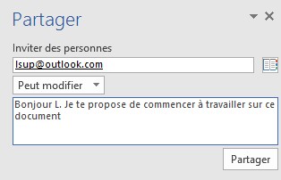 Une fois votre document enregistré sur OneDrive, vous pouvez le partager. Entrez l’adresse e-mail des personnes avec lesquelles vous voulez partager le document, séparées entre elles par des points virgules. Indiquez si ces personnes pourront modifier ou simplement afficher ce document, entrez éventuellement un message pour les prévenir du partage et cliquez sur Partager :