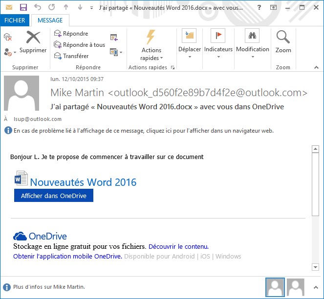 Quelle que soit la technique choisie, vos correspondants reçoivent quelques instants plus tard un message qui l’invite à accéder au document partagé :