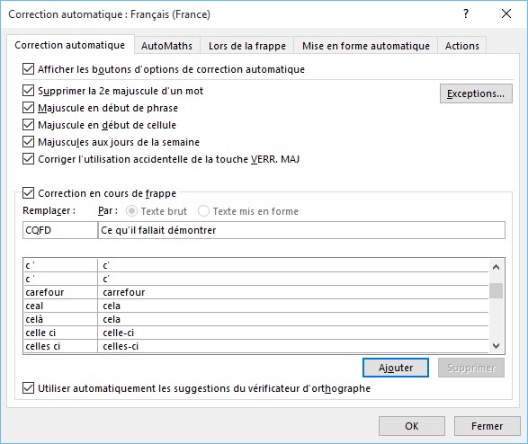 Sélectionnez l’onglet Fichier dans le ruban et cliquez sur Options. Dans la boîte de dialogue Options Word, sélectionnez l’onglet Vérification puis cliquez sur Options de correction automatique. Dans la boîte de dialogue Correction automatique, tapez CQFD dans la zone de texte Remplacer et Ce qu’il fallait démontrer dans la zone de texte Par.
