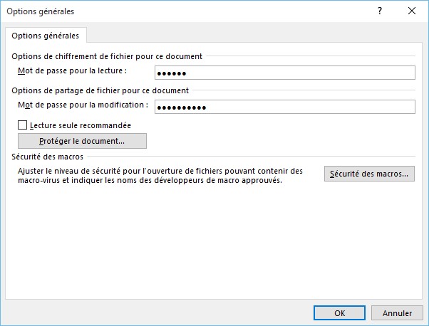 Cliquez sur OK, confirmez votre ou vos mots de passe, puis cliquez sur Enregistrer pour sauvegarder le document. Désormais, seules les personnes en possession des mots de passe pourront lire ou modifier votre document.