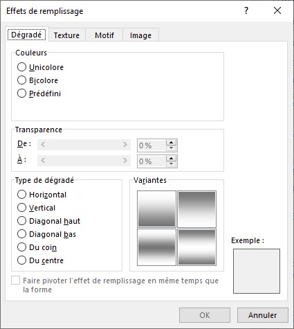 Vous pouvez également affecter un dégradé, une texture, un motif ou une image à l’arrière-plan du document. Cliquez sur Couleur de page puis sur Effets de remplissage et faites votre choix sous les onglets de la boîte de dialogue Effets de remplissage.