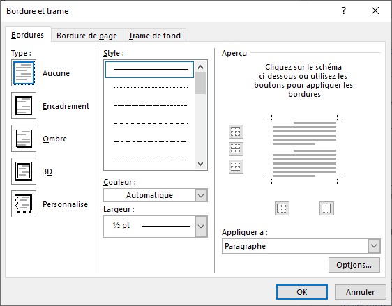 Pour appliquer rapidement une bordure et/ou une trame à un bloc de texte sélectionné, rien de tel que les icônes Bordures et Trame de fond du ruban (ces icônes se trouvent dans le groupe Paragraphe de l’onglet Accueil).