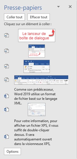 Le volet Presse-papiers s’affiche dans la partie gauche de la fenêtre de Word :