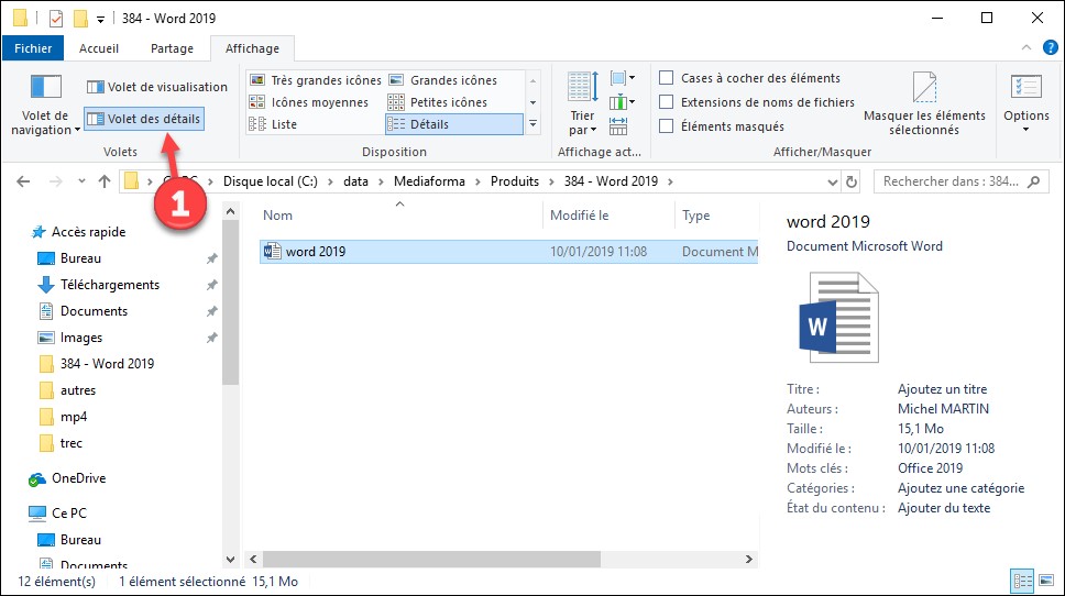 Vous pouvez également associer un mot-clé à un document en utilisant l’Explorateur de fichiers de Windows 10. Ouvrez le dossier dans lequel le document est stocké. Cliquez sur son nom et utilisez la zone Mots-clés dans le volet des détails (2). Si ce volet n’est pas affiché, basculez sur l’onglet Affichage et cliquez sur Volet des détails dans le groupe Volets (1).