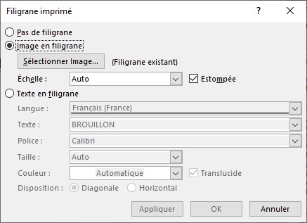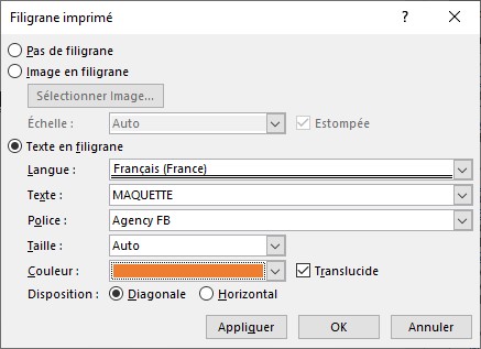 Si les filigranes prédéfinis ne répondent pas à vos attentes, vous pouvez définir votre propre filigrane. Cliquez sur Filigrane, dans le groupe Arrière-plan de la page, et choisissez Filigrane personnalisé dans le menu. La boîte de dialogue Filigrane imprimé s’affiche :