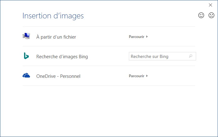 Si vous choisissez d’utiliser une image, sélectionnez l’option Image en filigrane et cliquez sur Sélectionner image. La boîte de dialogue Insertion d’images s’affiche. Le fichier peut être choisi dans vos unités de masse, sur Bing ou dans votre espace OneDrive :