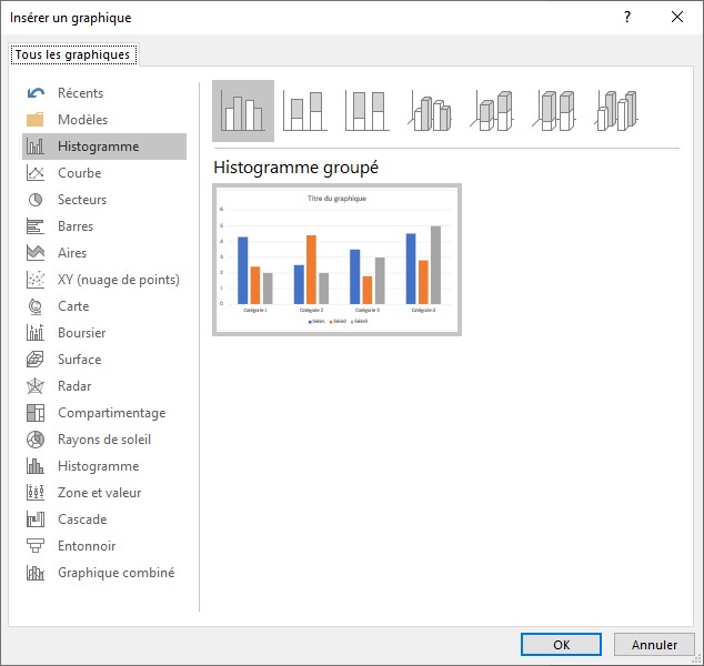 Pour insérer un graphique dans un document, basculez sur l’onglet Insertion dans le ruban, puis cliquez sur l’icône Graphique dans le groupe Illustrations. Cette action affiche la boîte de dialogue Insérer un graphique.