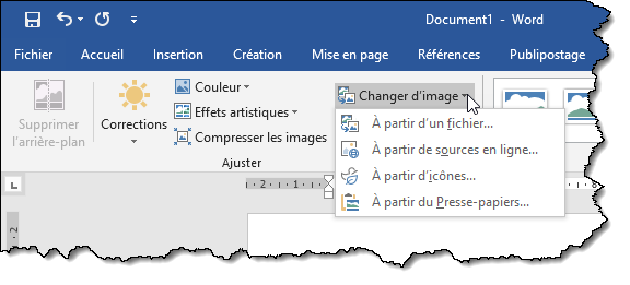 Si nécessaire, vous pouvez redimensionner la vidéo comme s’il s’agissait d’une image. Vous pouvez également changer la vignette qui la représente. Basculez sur l’onglet Outils Image/Mise en forme, cliquez sur l’icône Changer d’image dans le groupe Ajuster et indiquez la provenance de l’image :