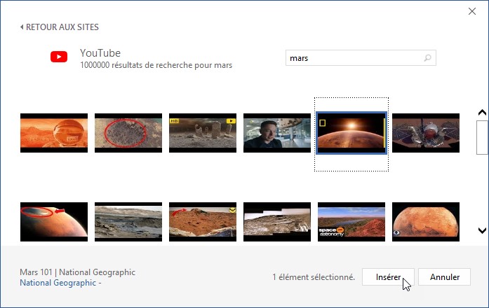 Entrez quelques mots dans la zone de texte Rechercher sur YouTube pour préciser la vidéo que vous recherchez puis appuyez sur la touche Entrée du clavier. Les résultats correspondants s’affichent sous la forme de vignettes. Cliquez sur l’une des vignettes puis sur Insérer pour insérer la vidéo dans le document :