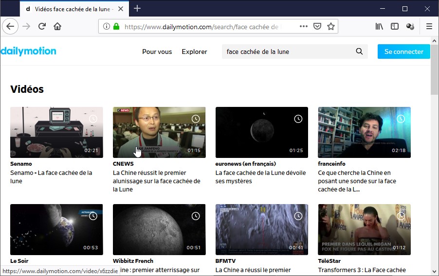 Nous allons insérer une vidéo qui parle de l’alunissage sur la face cachée de la lune. Pour trouver cette vidéo, nous tapons face cachée de la lune dans la zone de texte de recherche et nous appuyons sur la touche Entrée du clavier. Quelques instants plus tard, plusieurs résultats sont affichés sous la forme de vignettes :
