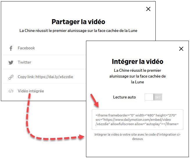 La boîte de dialogue Partager la vidéo s’affiche. Cliquez sur Vidéo intégrée. La boîte de dialogue Intégrer la vidéo s’affiche. Le code à utiliser se trouve dans le cadre :