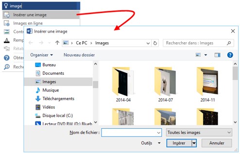 Dans la partie droite du ruban, la zone de saisie « Dites-nous ce que vous voulez faire » donne accès à la fonctionnalité Recherche d’Office. Cliquez sur cette zone et dites à Word ce que vous voulez faire. Par exemple, si vous voulez insérer une image, tapez image, puis cliquez sur Insérer une image. La boîte de dialogue Insérer une image est automatiquement affichée pour vous permettre d’insérer une image à partir de votre disque dur.