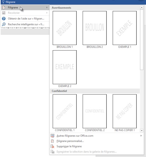 Un autre exemple : vous ne savez plus comment on insère un filigrane. Cliquez sur Dites-nous ce que vous voulez faire, tapez filigrane. Une entrée de menu s’affiche sous la zone de saisie. Il vous suffit de cliquer dessus pour accéder aux différents filigranes accessibles sous Word.
