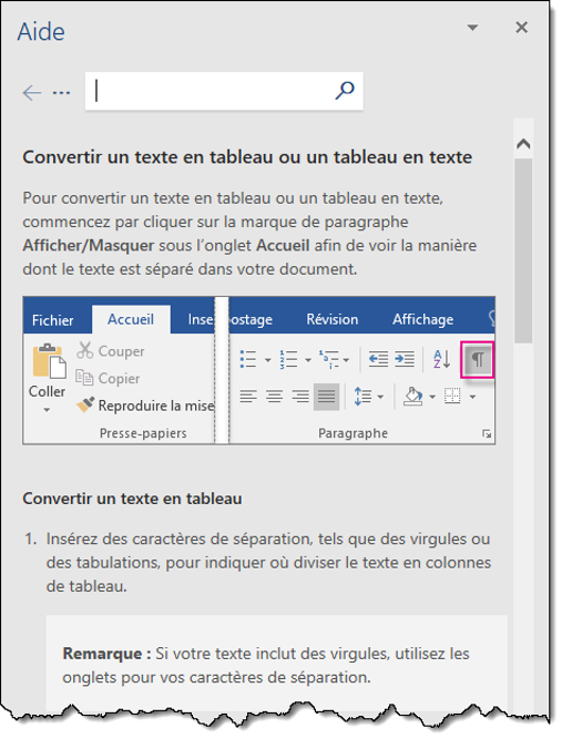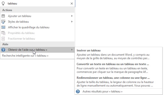 Enfin, la zone de saisie « Dites-nous ce que vous voulez faire » donne également accès à l’aide en ligne. Supposons par exemple que vous vouliez accéder aux rubriques d’aide concernant les tableaux. Cliquez sur Dites-nous ce que vous voulez faire, tapez tableau et cliquez sur Obtenir de l’aide sur « tableau » :
