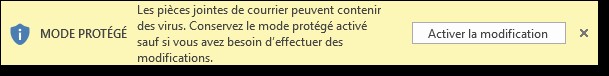A titre d’exemple, nous allons ouvrir un fichier Word reçu en pièce jointe dans un e-mail. Ce fichier est ouvert en mode protégé, comme en atteste le bandeau de couleur jaune affiché dans la partie supérieure de la fenêtre. Dans ce mode d’affichage, vous pouvez lire, mais pas modifier le document et l’exécution des macros est désactivée. Si vous êtes sûr de l’intégrité du document, cliquez sur Activer la modification.