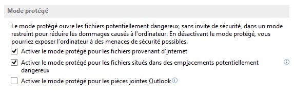 Le mode protégé de Word permet d’accroître la sécurité de l’ordinateur lorsque vous manipulez des fichiers téléchargés sur Internet ou attachés à des e-mails dont l’intégrité vous échappe.