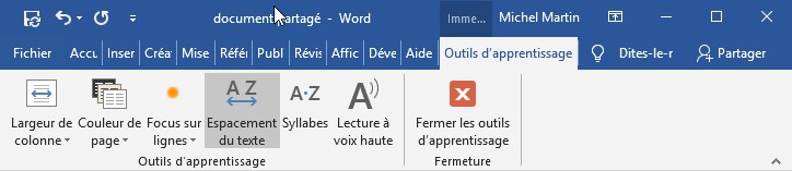 L’onglet Immersion/Outils d’apprentissage est ajouté dans la partie droite du ruban et automatiquement sélectionné :
