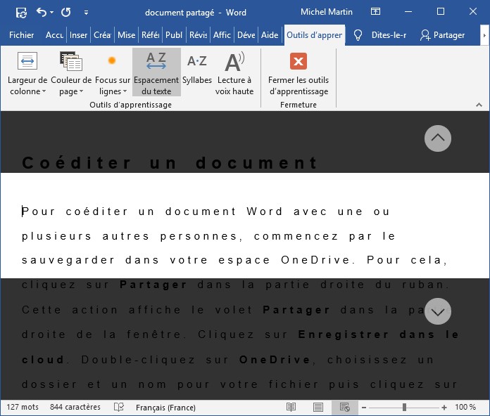 Vous avez du mal à lire le texte affiché dans Word ? Les outils d’apprentissage sont là pour améliorer votre expérience de lecture. En les utilisant, vous pourrez entre autres ajuster l’espacement du texte, la largeur des colonnes et la couleur des pages. Vous pourrez même demander à Cortana de lire une partie ou la totalité d’un document à voix haute.