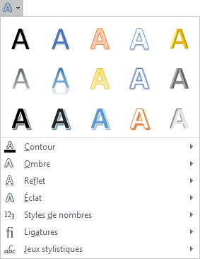 L’icône Effets de texte et typographie vous permet d’appliquer des effets prédéfinis sur le texte sélectionné. Tout aussi simplement que vous appliquez un attribut gras ou italique, vous pouvez choisir un effet typographique, appliquer un contour, un ombrage, un reflet ou un éclat.